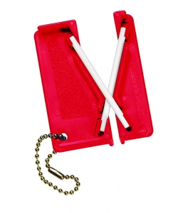 Hierzu drückt man die beiden Schärfstäbe heraus und legt sie nebeneinander in die Vertiefung, die sich auf dem Griff befindet und kann jetzt alle spitzen Gegenstände schärfen.